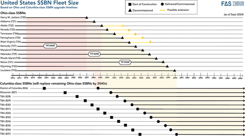 gThe first figure is the total number of nuclear-powered ballistic missile submarines (SSBNs) in the US fleet; the second is the maximum number of missiles that they can carry. All 14 SSBNs have now completed their mid-life reactor refueling overhaul and could potentially carry 280 missiles, but two to four are undergoing repairs at any given time and the Pentagon has stated that no more than 240 SLBMs will be deployed. The life-extended Trident II D5LE is replacing the original missile.